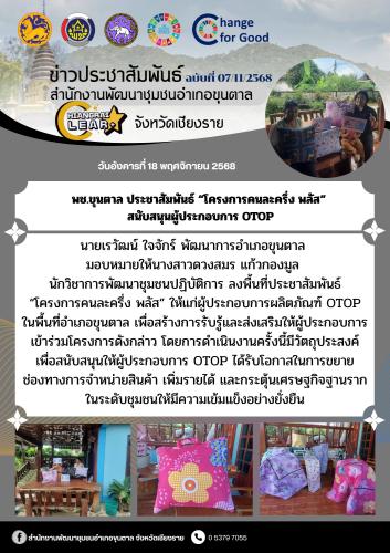 ◾️นายเรวัฒน์ ใจจักร์ พัฒนาการอำเภอขุนตาล มอบหมายให้นางสาวดวงสมร แก้วกองมูล นักวิชาการพัฒนาชุมชนปฏิบัติการ ลงพื้นที่ประชาสัมพันธ์ “โครงการคนละครึ่ง พลัส” ให้แก่ผู้ประกอบการผลิตภัณฑ์ OTOP ในพื้นที่อำเภอขุนตาล เพื่อสร้างการรับรู้และส่งเสริมให้ผู้ประกอบการเข้าร่วมโครงการดังกล่าว โดยการดำเนินงานครั้งนี้มีวัตถุประสงค์เพื่อสนับสนุนให้ผู้ประกอบการ OTOP ได้รับโอกาสในการขยายช่องทางการจำหน่ายสินค้า เพิ่มรายได้ และกระตุ้นเศรษฐกิจฐานรากในระดับชุมชนให้มีความเข้มแข็งอย่างยั่งยืน