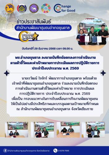 🌟นายเรวัฒน์ ใจจักร์ พัฒนาการอำเภอขุนตาล พร้อมด้วยเจ้าหน้าที่พัฒนาชุมชนอำเภอขุนตาล ร่วมลงนามบันทึกข้อตกลงการดำเนินงานตามตัวชี้วัดและค่าเป้าหมาย การประเมินผลการปฏิบัติราชการ ประจำปีงบประมาณ พ.ศ. 2569 เพื่อเป็นกรอบแนวทางในการขับเคลื่อนภารกิจงานพัฒนาชุมชนให้เป็นไปอย่างมีประสิทธิภาพและบรรลุผลตามเป้าหมายที่กำหนด ณ สำนักงานพัฒนาชุมชนอำเภอขุนตาล จังหวัดเชียงราย